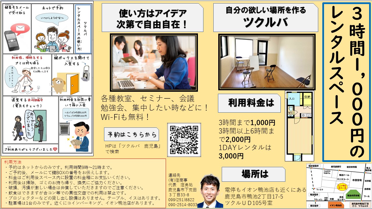 近くの下荒田にも雰囲気の違う3時間500円のレンタルスペース「つむぐば」を運営しています。